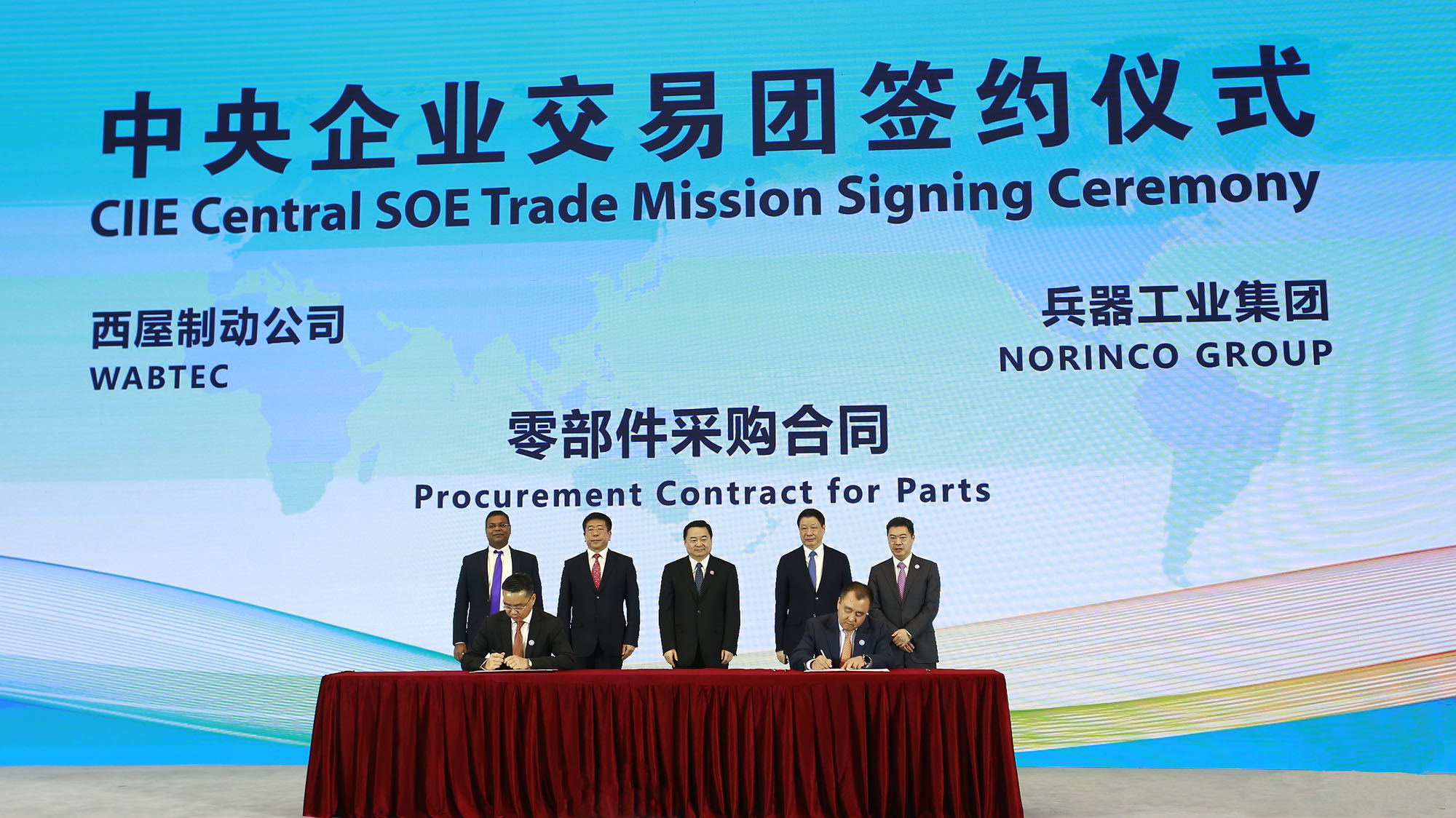 在11月6日上午舉行的中央企業交易團簽約儀式上,在國資委黨委書記、主任郝鵬,上海市委副書記、市長應勇,國資委副主任任洪斌,兵器工業集團副總經理鄒文超,簽約外方代表的見證下,兵器工業集團作為15戶央企代表之一,所屬北方重工業集團有限公司北方股份與西屋制動公司簽署電動輪礦用車電驅動系統采購和意向合同。