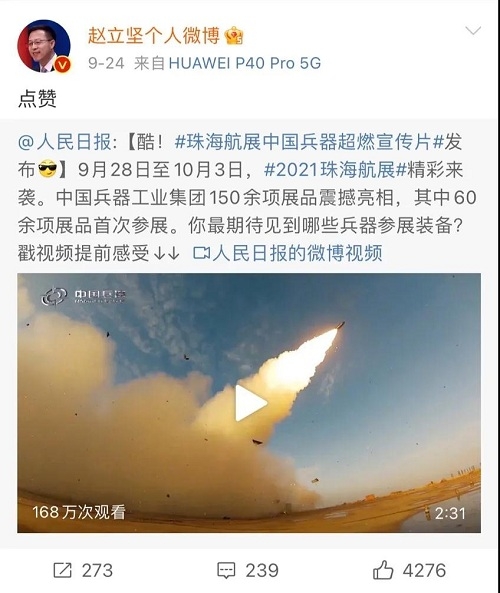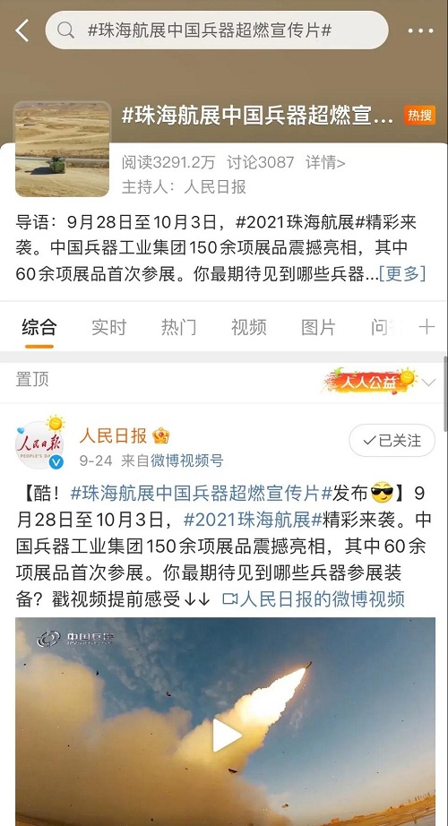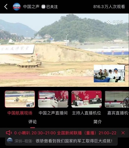 人民日報、新華社、中國日報、共青團中央、國資小新、騰訊軍事、鳳凰軍事、新浪軍事等新媒體發布的集團公司航展宣傳片等視頻作品燃爆全網,閱讀量突破三千萬人次,得到外交部發言人趙立堅轉載點贊。集團公司微信、微博、抖音號、微信視頻號等新媒體宣傳片播放閱讀量超過400萬人次。同時,央視新聞、新華社、中國之聲、央視軍事、央視新媒體、解放軍報、共青團中央、國資小新、環球時報等多家媒體對集團公司靜、動態展區進行現場直播,在電視端、客戶端、微信視頻號、微博、B站、快手、抖音等平臺受到高度關注。著名軍事專家杜文龍、央視主持人顧國寧、央廣中國之聲主持人王藝等直播兵器館、動態表演區裝備。