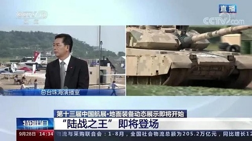 央視《新聞聯播》報道第十三屆中國航展,著重介紹了VT4主戰坦克,關注航展公眾日中國兵器館情況。9月28日下午央視《新聞直播間》航展特別節目《藍天盛會》邀請集團公司訪談嘉賓做客直播間對中國兵器館兵器工業集團展區等進行1小時直播;9月28日下午、10月2日下午分別對地面裝備動態表演進行兩場直播。央視《朝聞天下》、《新聞直播間》、《共同關注》、《天下財經》、《軍事報道》、《正午國防軍事》、《軍武零距離》等相繼推出集團公司參展裝備的報道。