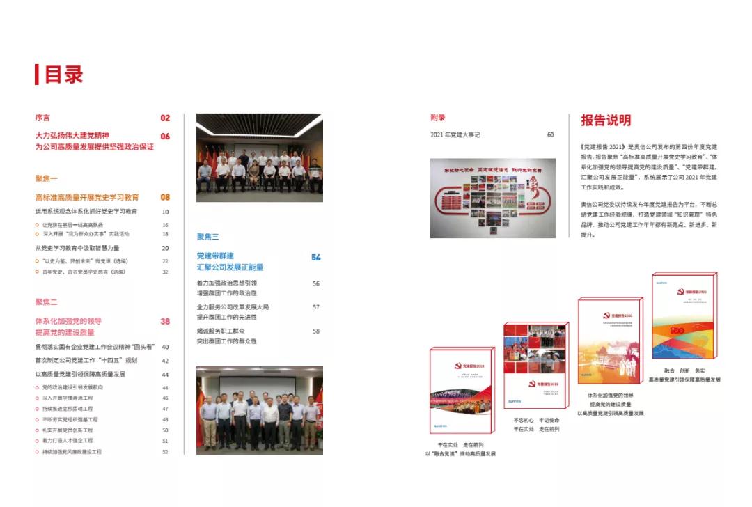 作為奧信公司黨建工作創(chuàng)新成果,《黨建報告2021》聚焦 “高標準高質量開展黨史學習教育”、“體系化加強黨的領導提高黨的建設質量”、“黨建帶群建,匯聚公司發(fā)展正能量”,全面展示了公司2021年黨建工作實踐與成效。報告既是奧信公司黨委和16個黨支部、102名共產(chǎn)黨員向上級黨組織交出的一份黨建工作答卷,也是弘揚偉大建黨精神,奮力走好新時代“趕考之路”,以高質量黨建引領保障高質量發(fā)展,不斷推動企業(yè)做強做優(yōu)做大的動員令。