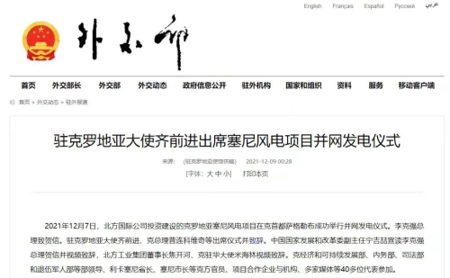 2021年12月7日,中國(guó)兵器工業(yè)集團(tuán)有限公司北方公司所屬北方國(guó)際投資、建設(shè)和運(yùn)營(yíng)的塞尼156MW風(fēng)電項(xiàng)目在克羅地亞首都薩格勒布隆重舉行并網(wǎng)發(fā)電儀式。李克強(qiáng)總理致賀信。克羅地亞總理安德烈·普連科維奇,中國(guó)駐克羅地亞大使齊前進(jìn)出席儀式并致辭。中國(guó)國(guó)家發(fā)展和改革委員會(huì)副主任寧吉喆宣讀李克強(qiáng)總理賀信并視頻致辭,中國(guó)兵器工業(yè)集團(tuán)有限公司董事長(zhǎng)焦開(kāi)河、克駐華大使米海林視頻致辭。 中華人民共和國(guó)外交部報(bào)道 普連科維奇總理在致辭中表示,感謝李克強(qiáng)總理發(fā)來(lái)賀信,他與中國(guó)領(lǐng)導(dǎo)人一直非常重視塞尼風(fēng)電項(xiàng)目投資與建設(shè)。祝賀項(xiàng)目克服疫情與地震等影響,成功并網(wǎng)發(fā)電。增加清潔可再生能源、綠色電力對(duì)克乃至歐洲都很重要,克政府的重要戰(zhàn)略和目標(biāo)之一就是低碳發(fā)展和增加清潔能源供應(yīng)。塞尼風(fēng)電項(xiàng)目占克總發(fā)電量將達(dá)3.5%,對(duì)克實(shí)現(xiàn)2022年可再生能源比例30%目標(biāo)具有很大幫助。此次投資使北方國(guó)際成為在克最大的清潔能源投資企業(yè)。非常歡迎更多中國(guó)企業(yè)擴(kuò)大對(duì)克投資。 寧吉喆宣讀李克強(qiáng)總理賀信并視頻致辭時(shí)表示,2017年11月第六次中國(guó)—中東歐國(guó)家領(lǐng)導(dǎo)人會(huì)晤期間,在李克強(qiáng)總理和普連科維奇總理等中東歐16國(guó)領(lǐng)導(dǎo)人的共同見(jiàn)證下,塞尼項(xiàng)目簽署了協(xié)議。項(xiàng)目既是中國(guó)堅(jiān)定踐行綠色發(fā)展理念的具體體現(xiàn),也是中國(guó)深化與克羅地亞、與中東歐國(guó)家務(wù)實(shí)合作的生動(dòng)實(shí)踐。希望中克兩國(guó)政府部門(mén),企業(yè)等有關(guān)各方共同努力、相互配合,運(yùn)營(yíng)好塞尼項(xiàng)目,打造出中歐綠色合作的樣板,帶動(dòng)兩國(guó)務(wù)實(shí)合作持續(xù)深入發(fā)展,造福兩國(guó)人民。