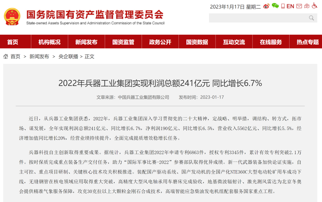 國資委網站:2022年兵器工業集團實現利潤總額241億元 同比增長6.7%