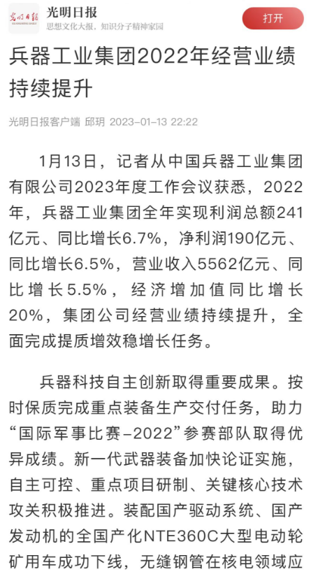 光明日報客戶端:兵器工業集團2022年經營業績持續提升