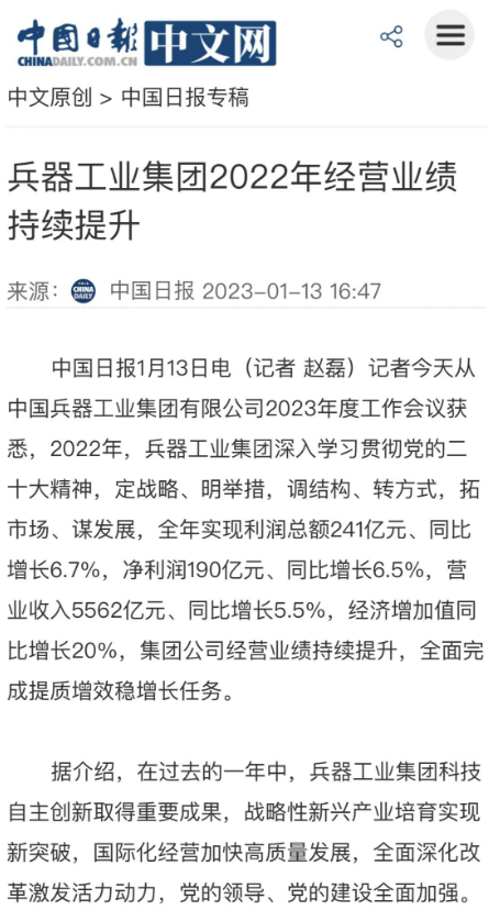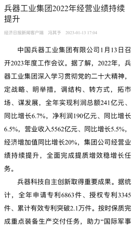 中國新聞網:2022年兵器工業集團實現利潤總額241億元 同比增長6.7%