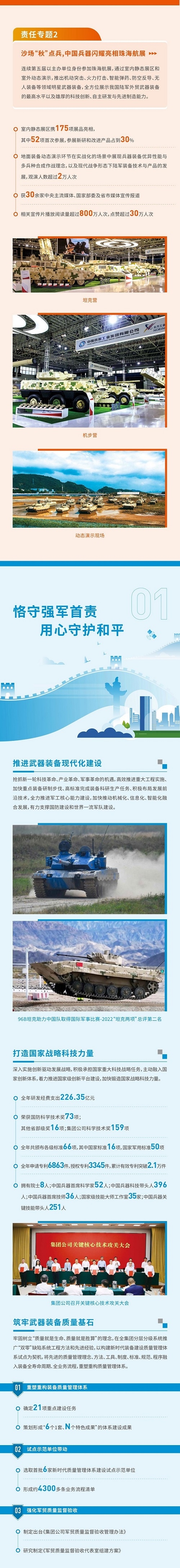 《報告》開篇設(shè)置“突出政治引領(lǐng),全面加強黨的領(lǐng)導(dǎo)黨的建設(shè)”“沙場‘秋’點兵,中國兵器閃耀亮相珠海航展”兩個責(zé)任專題,聚焦集團公司加強黨建、強軍報國的擔(dān)當(dāng)作為,書寫集團公司在新時代新征程上的奮進答卷。主體章節(jié)以“用心守護和平、用力爭創(chuàng)一流、用情溫暖社會”為主題,從恪守強軍首責(zé)、服務(wù)經(jīng)濟建設(shè)、共創(chuàng)美好生活三個維度展現(xiàn)了集團公司立足“1+5”戰(zhàn)略和“雙十”規(guī)劃,聚焦新時代新征程新任務(wù)高質(zhì)量履行政治責(zé)任、經(jīng)濟責(zé)任和社會責(zé)任的具體行動和成效亮點,詮釋了集團公司服務(wù)國家戰(zhàn)略、服務(wù)國防和軍隊現(xiàn)代化建設(shè)、服務(wù)國家經(jīng)濟社會發(fā)展的職責(zé)使命。