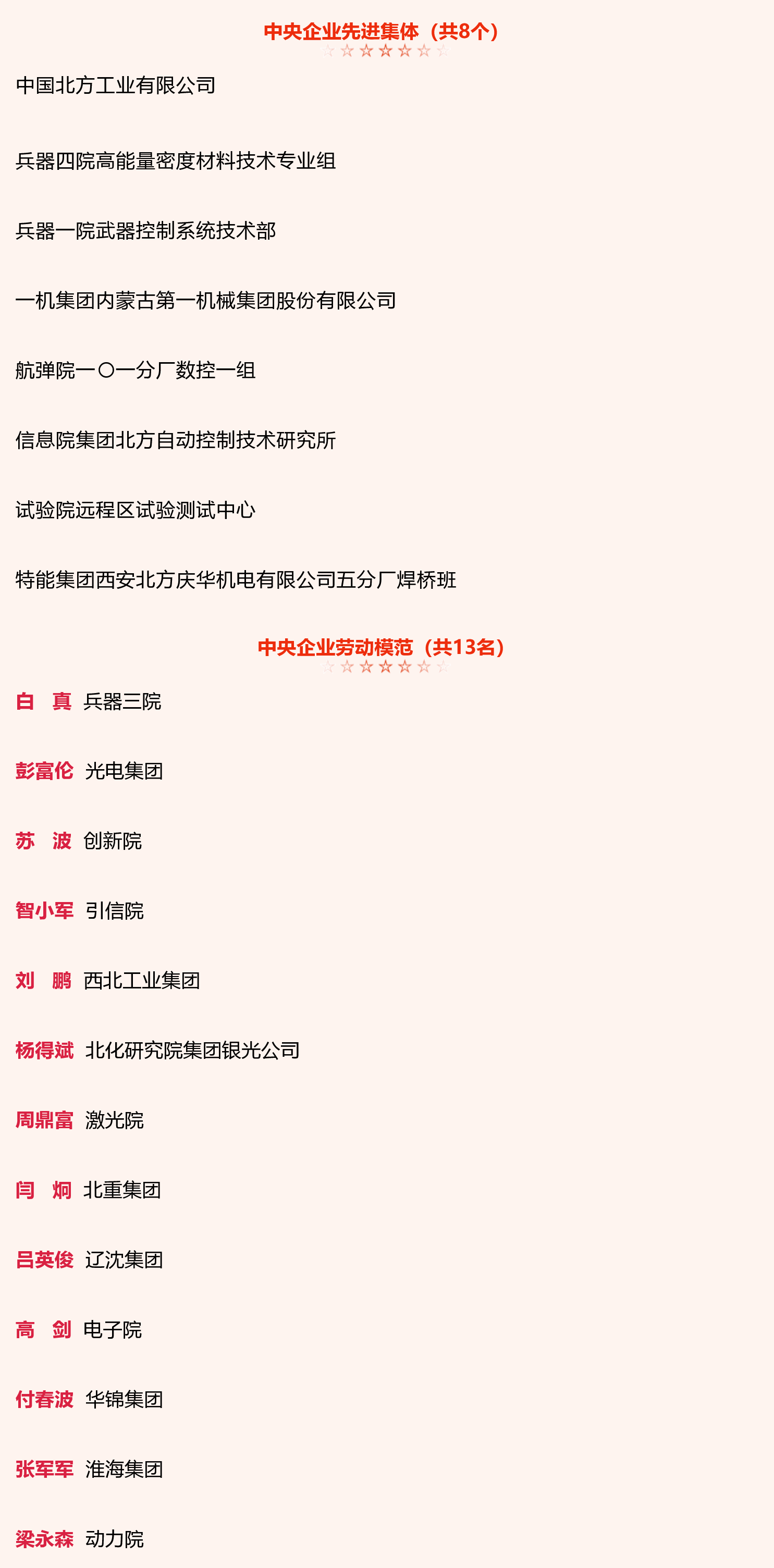 兵器工業(yè)集團(tuán)8個(gè)集體和13名個(gè)人獲中央企業(yè)先進(jìn)集體和勞動(dòng)模范表彰 |