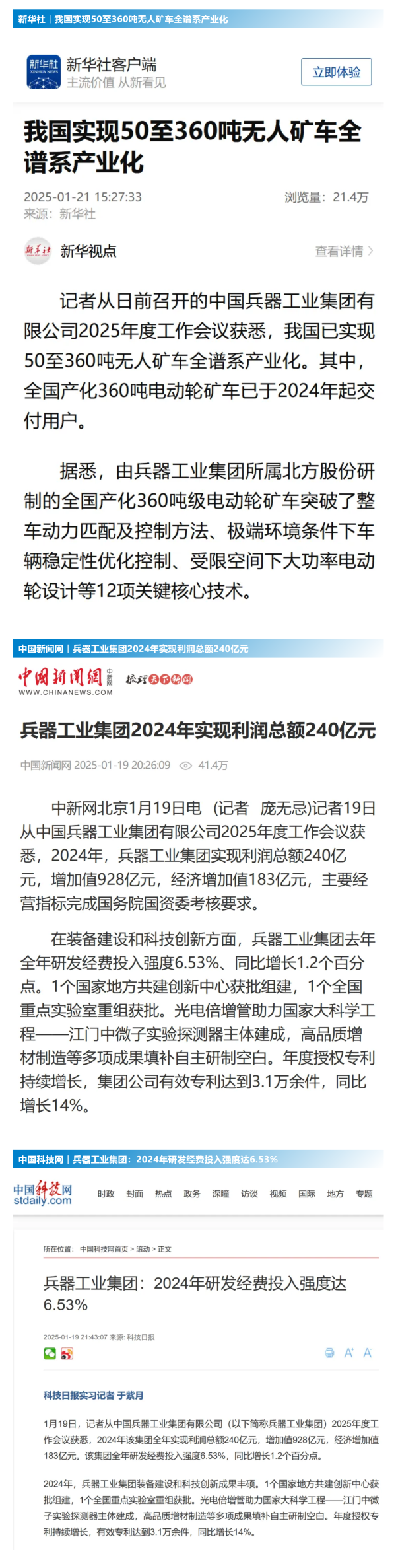 集團(tuán)公司2024年取得的成績(jī)及下一步重點(diǎn)工作受到社會(huì)媒體廣泛關(guān)注。新華社、中國(guó)新聞網(wǎng)、中國(guó)科技網(wǎng)、光明日?qǐng)?bào)客戶(hù)端、經(jīng)濟(jì)日?qǐng)?bào)客戶(hù)端、中國(guó)日?qǐng)?bào)網(wǎng)、國(guó)務(wù)院國(guó)資委網(wǎng)站、學(xué)習(xí)強(qiáng)國(guó)中央企業(yè)學(xué)習(xí)平臺(tái)、新浪網(wǎng)、網(wǎng)易網(wǎng)、搜狐網(wǎng)、騰訊網(wǎng)、鳳凰網(wǎng)等中央主流媒體、國(guó)家部委網(wǎng)站及知名網(wǎng)絡(luò)媒體對(duì)集團(tuán)公司2025年度工作會(huì)議進(jìn)行了報(bào)道,重點(diǎn)關(guān)注集團(tuán)公司經(jīng)營(yíng)業(yè)績(jī)、科技創(chuàng)新、產(chǎn)業(yè)結(jié)構(gòu)布局優(yōu)化等情況。其中,新華社以《我國(guó)實(shí)現(xiàn)50至360噸無(wú)人礦車(chē)全譜系產(chǎn)業(yè)化》為題,重點(diǎn)報(bào)道了集團(tuán)公司在推動(dòng)智能制造水平提升方面取得的成效;中國(guó)新聞網(wǎng)、光明日?qǐng)?bào)客戶(hù)端、經(jīng)濟(jì)日?qǐng)?bào)客戶(hù)端、中國(guó)日?qǐng)?bào)網(wǎng)等就集團(tuán)公司2024年度經(jīng)營(yíng)業(yè)績(jī)及各項(xiàng)工作取得的成果進(jìn)行報(bào)道;中國(guó)科技網(wǎng)著重報(bào)道了集團(tuán)公司在科技創(chuàng)新和優(yōu)化產(chǎn)業(yè)結(jié)構(gòu)布局方面的最新進(jìn)展。集團(tuán)公司門(mén)戶(hù)網(wǎng)站、微信公眾號(hào)、微博等新媒體平臺(tái)以及《中國(guó)兵工報(bào)》也對(duì)集團(tuán)公司工作會(huì)議進(jìn)行了及時(shí)報(bào)道,各成員單位紛紛對(duì)相關(guān)內(nèi)容進(jìn)行轉(zhuǎn)載,引發(fā)全系統(tǒng)關(guān)注。