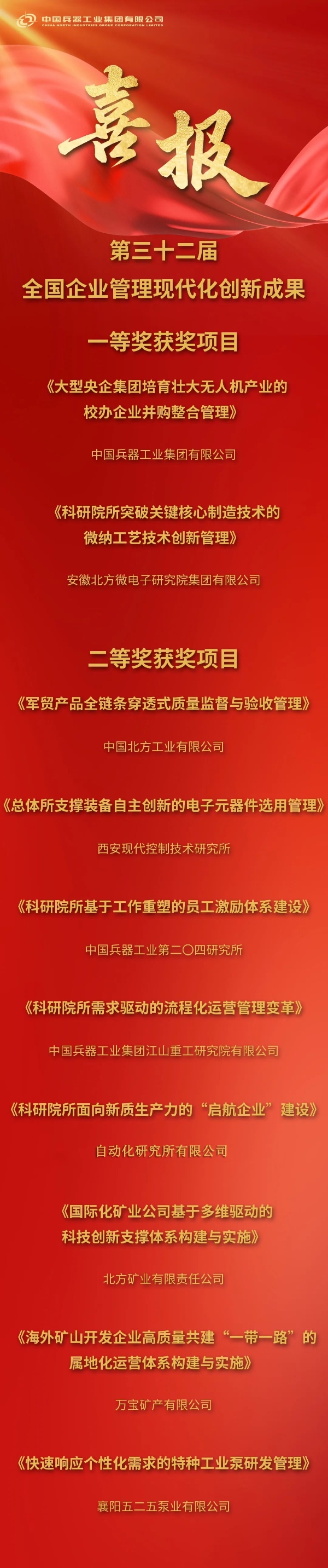 12月25日,全國企業管理現代化創新成果審定委員會發布第三十二屆全國企業管理現代化創新成果名單,兵器工業集團2項成果獲評一等、8項成果獲評二等,創歷史最好成績。